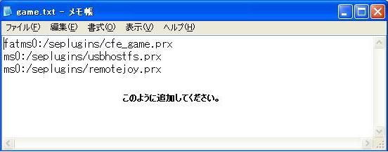 5,vsh.txtとgame.txtにms0:/seplugins/usbhostfs.prxとms0:/seplugins/remotejoy.prxの2行を追記。